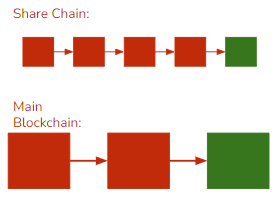 Peer-to-Peer Mining Pool - Centralized mining pools slightly defeat the point of blockchain being centralized so as a reaction p2p mining pools came to existence. Peer-to-Peer mining pools operate on a share-chain that is identical to the main blockchain and even includes & verifies the same data, but it has a lower difficulty and smaller ABCT. With a smaller difficulty and more regular blocks we can accurately gauge how much processing power each participant has by the number of blocks they add over a period of time, typically two weeks. These block additions are recorded in the coinbase transaction for that period of time and by the law of probability, even with a lower difficulty, one of the hash values will eventually be low enough to even meet the main blockchain’s target. When this happens the block is added to the main chain and all the miners that added a block on the share-chain in the past 2 weeks are rewarded.